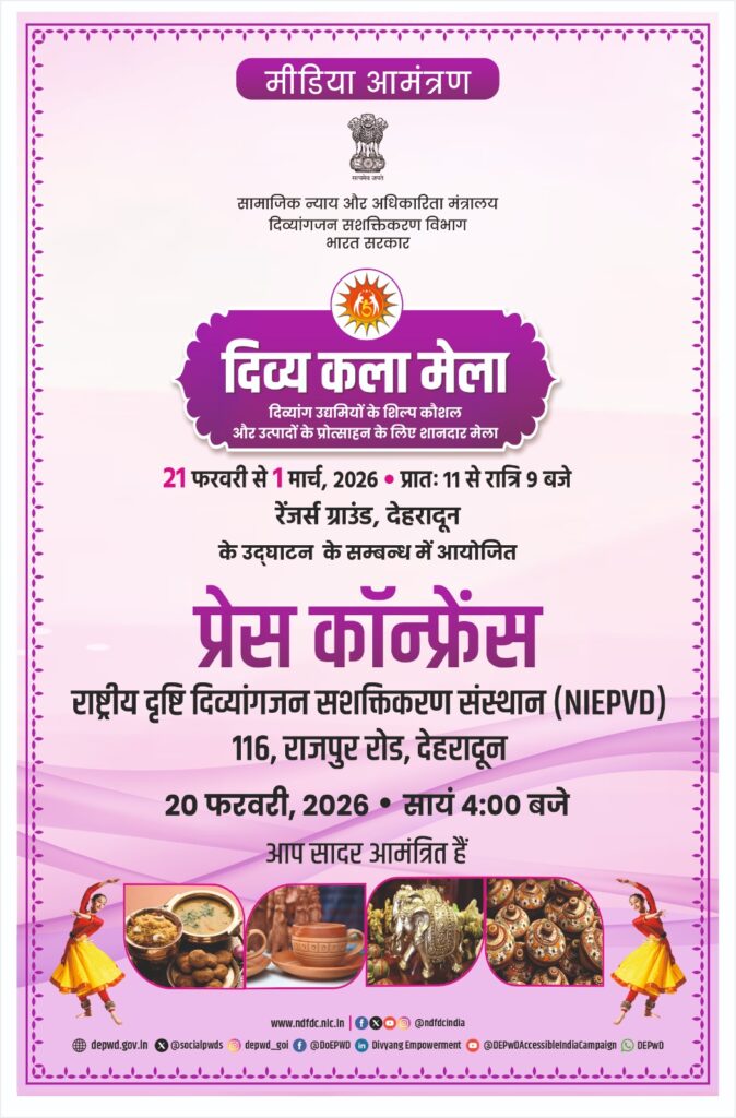 राजधानी देहरादून के रेंजर ग्राउंड में 21 फरवरी से 01 मार्च 2026 तक ‘‘दिव्य कला मेला’’ का भव्य आयोजन किया जाएगा। यह मेला भारत सरकार द्वारा संचालित National Handicapped Finance and Development Corporation के तत्वावधान में आयोजित हो रहा है।