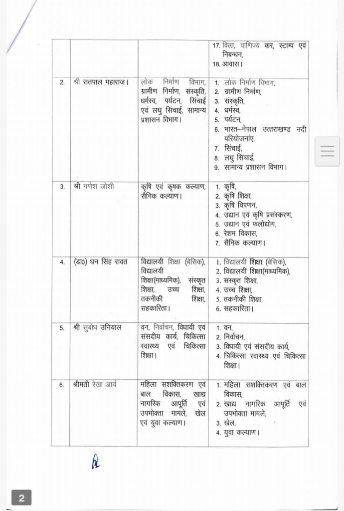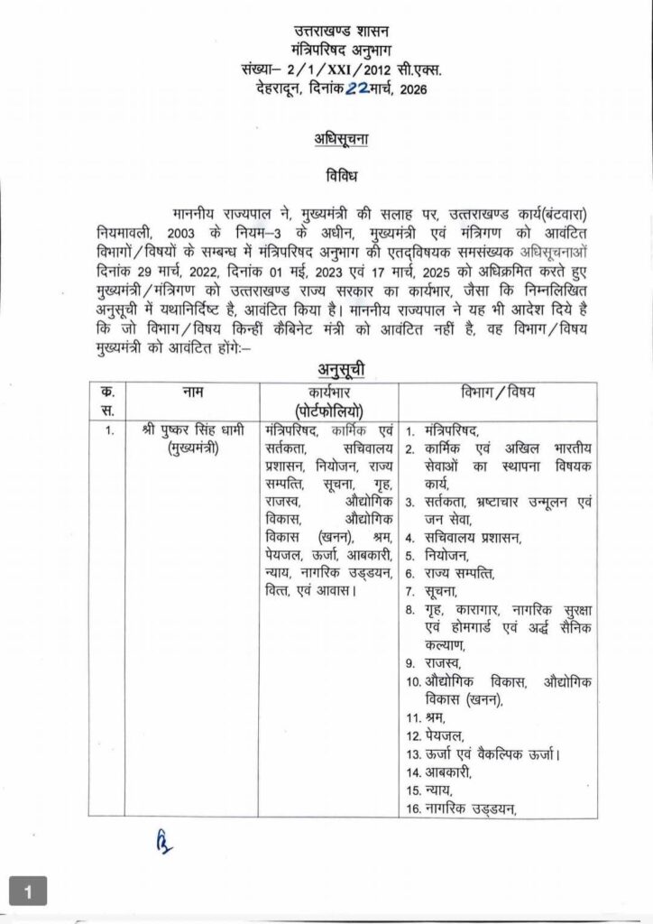 उत्तराखंड में मंत्रिमंडल विस्तार के बाद अब विभागों का बहुप्रतीक्षित बंटवारा हो गया है। मुख्यमंत्री Pushkar Singh Dhami ने कई अहम विभाग अपने पास रखते हुए बाकी जिम्मेदारियां मंत्रियों में बांट दी हैं।