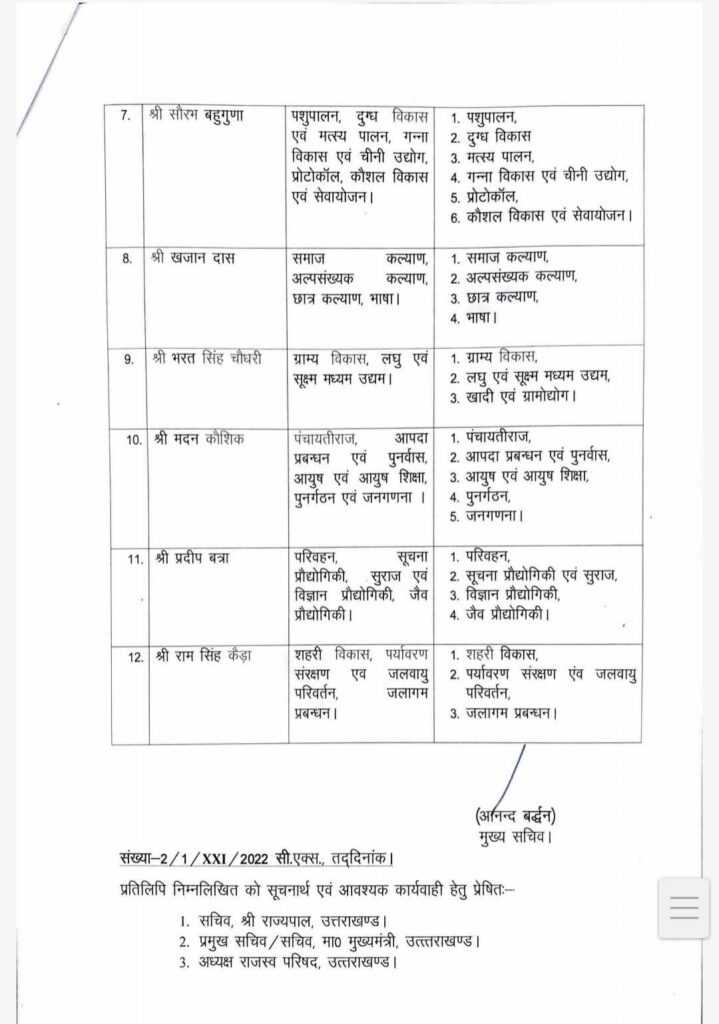 मंत्रिमंडल विस्तार के बाद मुख्यमंत्री पुष्कर सिंह धामी ने विभागों का बंटवारा कर दिया है। अब मुख्यमंत्री सामान्य प्रशासन, गृह, कार्मिक, सतर्कता, नियुक्ति एवं प्रशिक्षण और सूचना एवं जनसंपर्क जैसे महत्वपूर्ण विभाग खुद देखेंगे।
