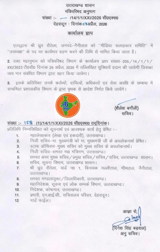 उत्तराखंड में अहम नियुक्ति: ध्रुव रोटेला को मीडिया सलाहकार समिति का उपाध्यक्ष बनाया गया, शासन ने जारी किया आदेश