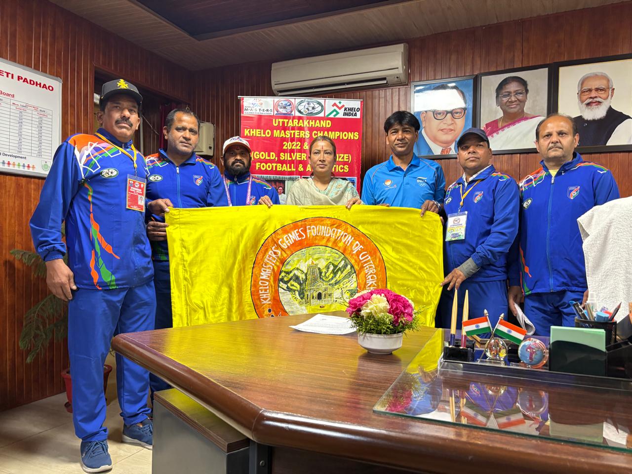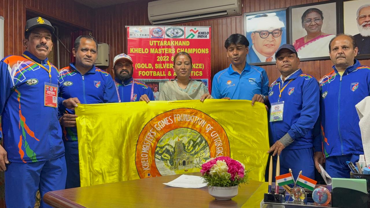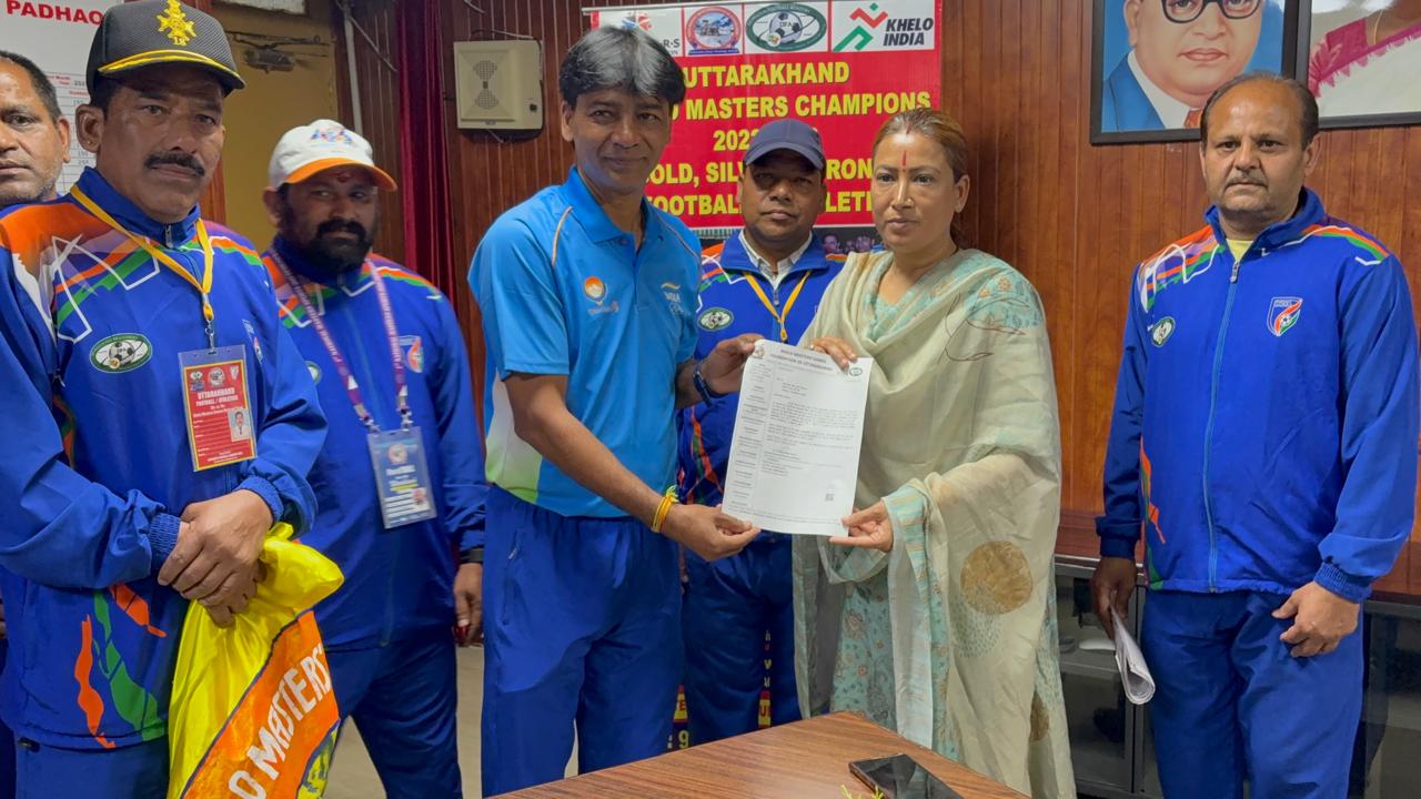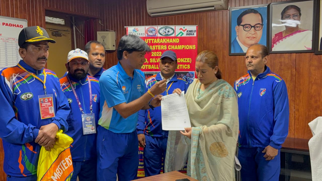 खेलो मास्टर्स नेशनल गेम्स 2025 फुटबाल टीम, एथलेटिक्स टीम को खेल मंत्री रेखाआर्य ने मदद के लिए दिया आश्वासन