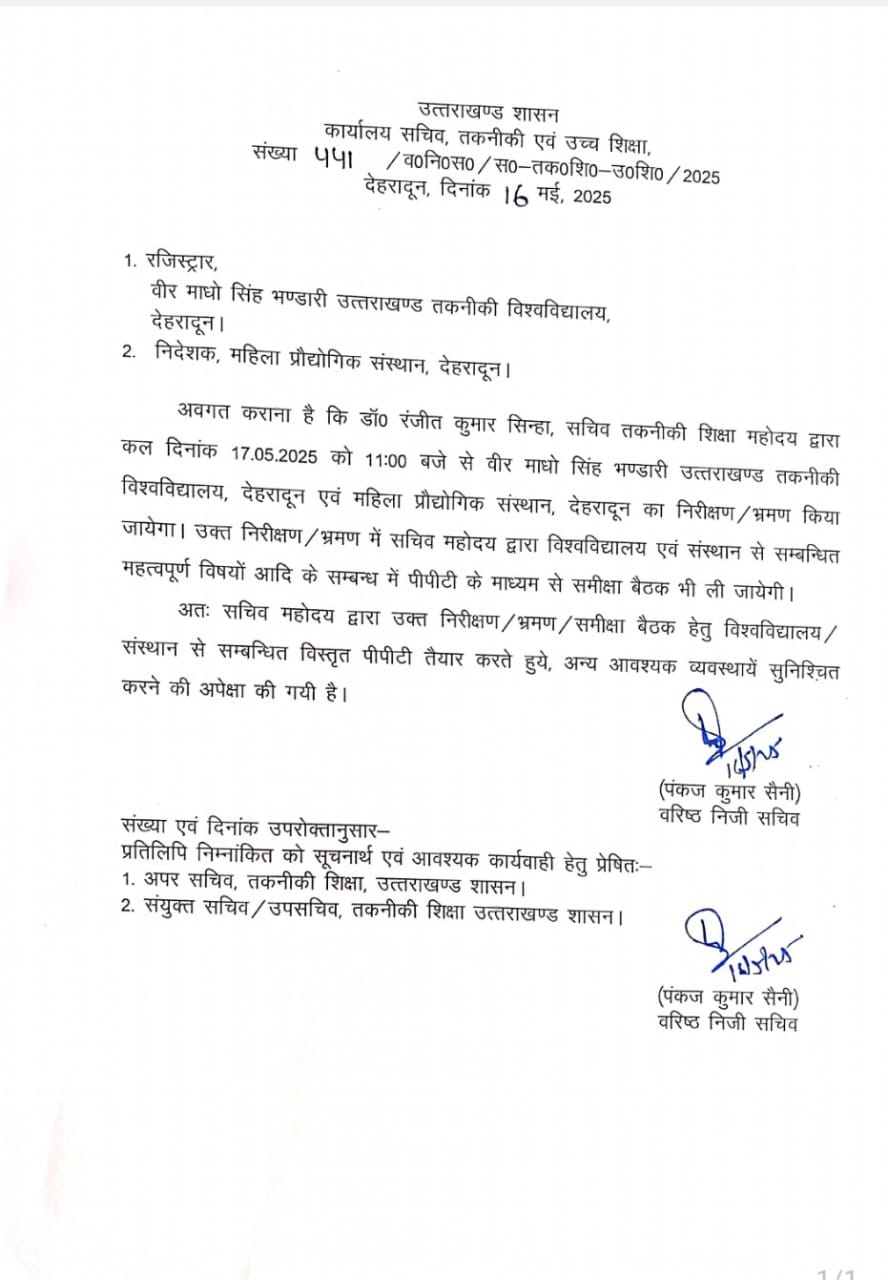 तकनीकी शिक्षा सचिव खुद करेंगे उत्तराखंड तकनीकी विश्वविद्यालय का निरीक्षण : सिद्धार्थ अग्रवाल