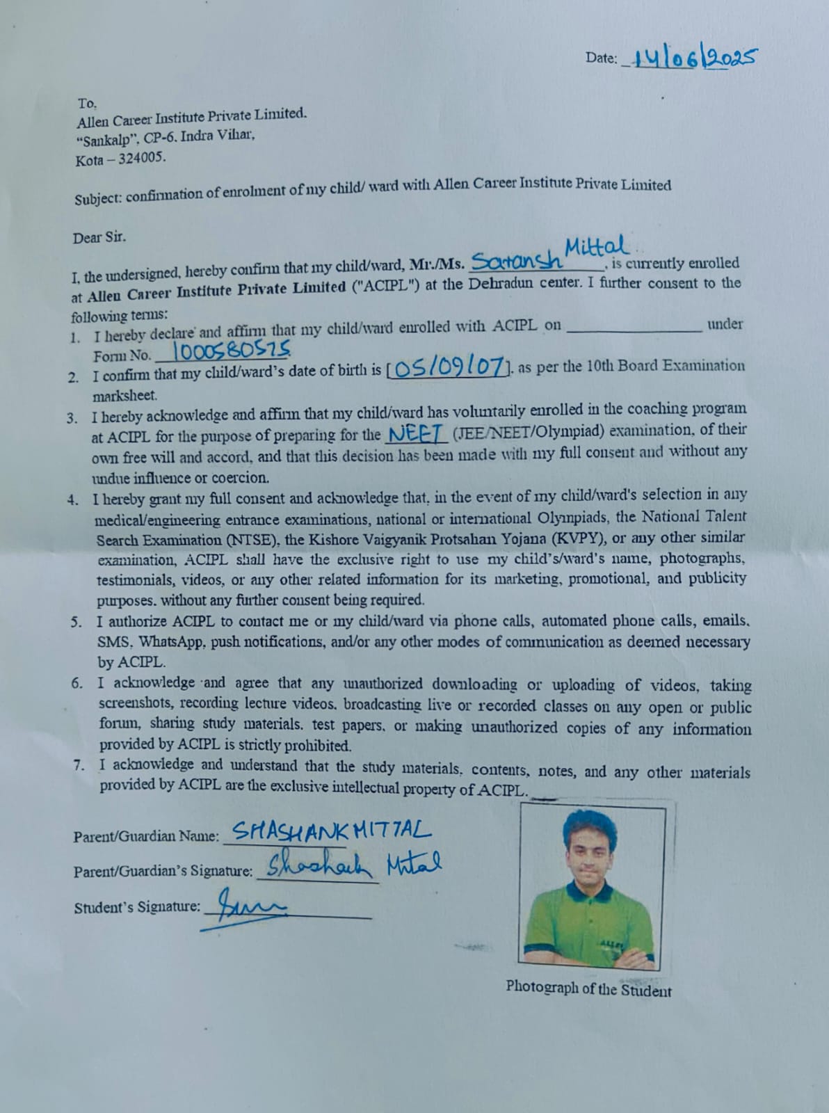 संस्थान ने एडमिशन रिकॉर्ड, उपस्थिति रजिस्टर, आंतरिक परीक्षा परिणाम और फीस भुगतान पावती जैसे दस्तावेज़ जारी कर यह प्रमाणित किया कि सारांश मित्तल Allen देहरादून के नियमित छात्र थे। Allen ने यह भी कहा कि वह विद्यार्थियों की मेहनत और संस्थान के मार्गदर्शन को साथ लेकर उनके उज्ज्वल भविष्य के लिए प्रतिबद्ध है