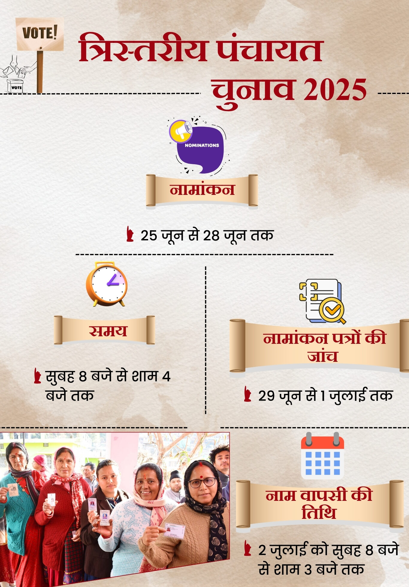 उत्तराखंड त्रिस्तरीय पंचायत चुनाव की अधिसूचना जारी हो चुकी है. 25 जून से 28 जून 2025 तक सुबह 8 बजे से नामांकन की प्रक्रिया चलेगी.
