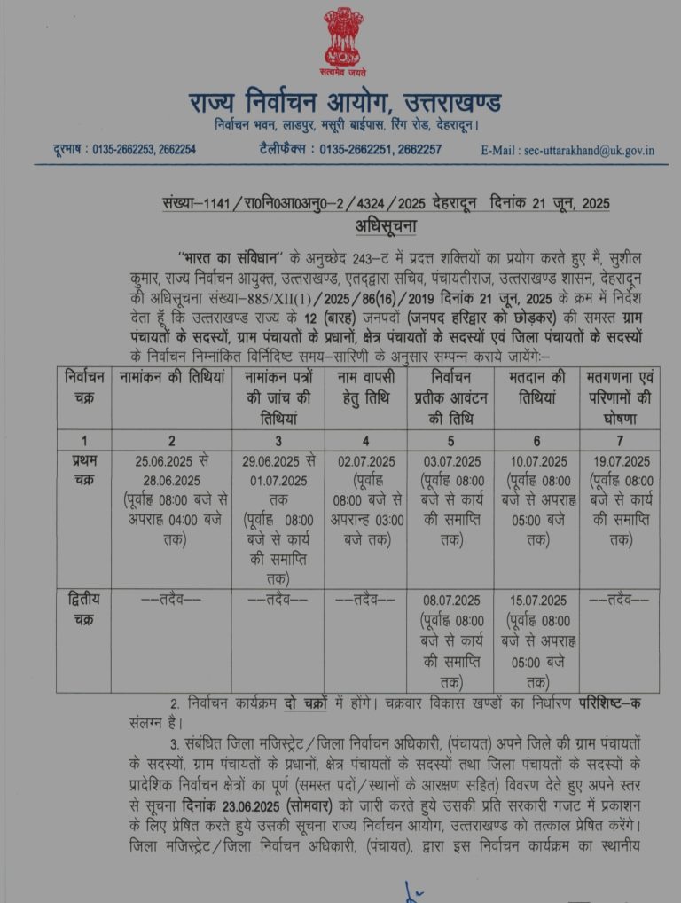 उत्तराखंड त्रिस्तरीय पंचायत चुनाव का ऐलान, दो चरणों में होगा मतदान, 19 जुलाई को मतगणना –
