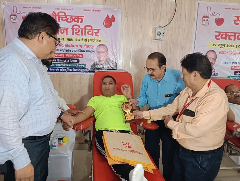 देहरादून के मोथरोवाला स्थित अमोलाज रेस्टोरेंट में ‘विचार एक नई सोच’ सामाजिक संगठन और 17 सहयोगी संस्थाओं द्वारा आयोजित स्वास्थ्य संवाद व स्वैच्छिक रक्तदान शिविर में समाजसेवा की मिसाल पेश हुई। खराब मौसम के बावजूद बड़ी संख्या में लोगों ने भाग लिया और कुल 216 यूनिट रक्तदान हुआ। कार्यक्रम का संचालन योगम्बर पोली, संस्था के सचिव राकेश बिजलवाण ने संयुक्त रूप से किया। इस मौके पर संस्था के अध्यक्ष अरूण चमोली, सचिव राकेश बिजलवाण, संरक्षक डॉ एसडीजोशी, अरूण शर्मा, मनोज इष्टवाल, जय प्रकाश अमोला, उपाध्यक्ष घनश्याम जोशी, सह सचिव अवधेश नौटियाल, कोषाध्यक्ष अमित अमोली, मीडिया सचिव रमन जायसवाल, सांस्कृतिक सचिव जगमोहन मौर्य, सह मीडिया सचिव शिवराज राणा सहित सभी संस्थाओं से जुड़े पदाधिकारी मौजूद रहे।