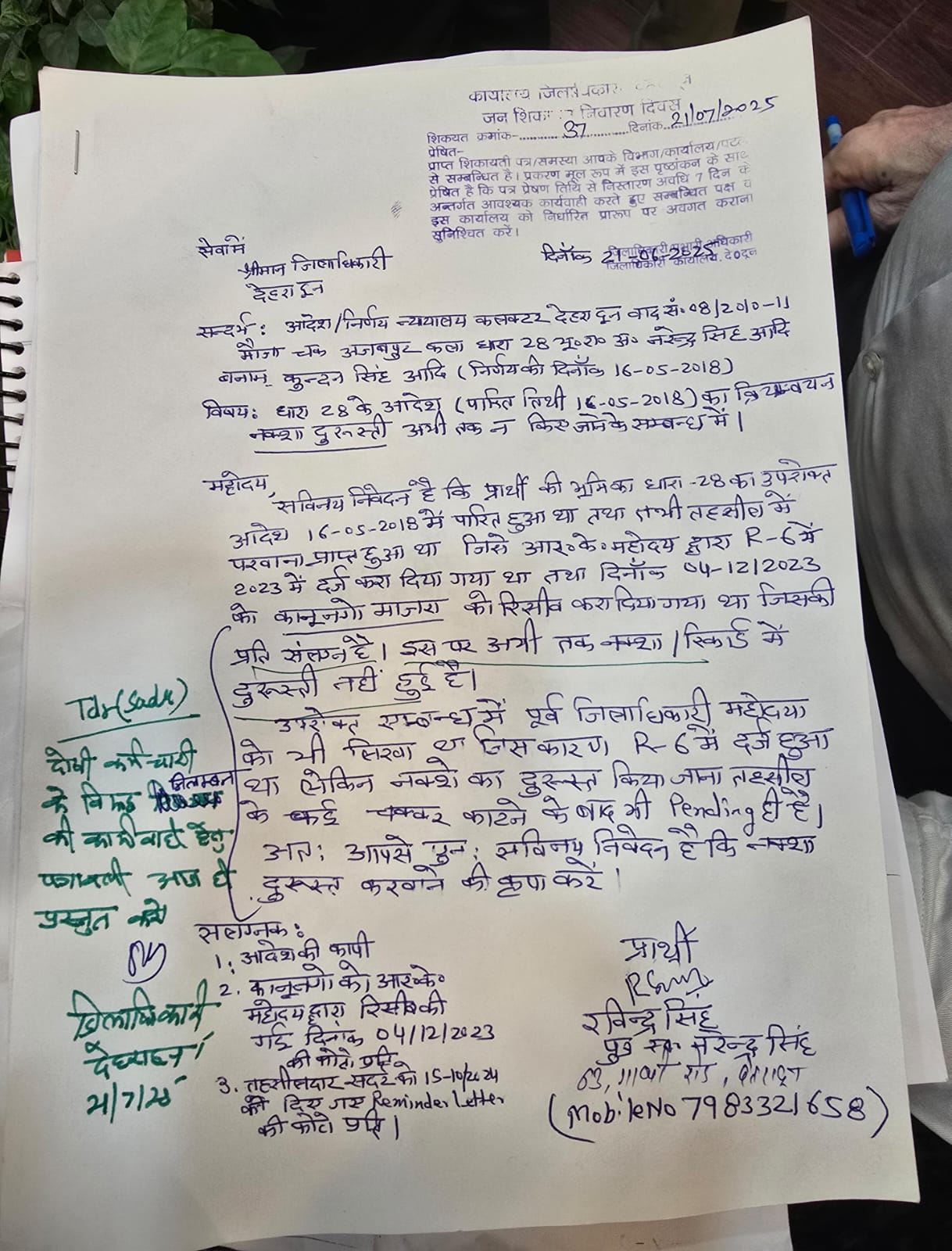 दरअसल जनता दर्शन कार्यक्रम में गांधी रोड निवासी रविन्द्र सिंह ने डीएम को फरियाद लगाकर बताया कि उनकी भूमि का धारा 28 अन्तर्गत 16 मई 2018 को कलक्टर ने पारित किये थे आदेश। तथा तहसील में परवाना प्राप्त हुआ था, जिसे आरके द्वारा आर-6 में 2023 में दर्ज करा दिया था तथा दिसम्बर 2023 में कानूनगो माजरा को प्राप्ति करा दिया था किन्तु अभी तक क्रियान्वयन नक्शा दुरूस्ती नही किया गया है, तहसील के कई चक्कर लगाने पर भी नक्शा दुरूस्त नही किया गया है।