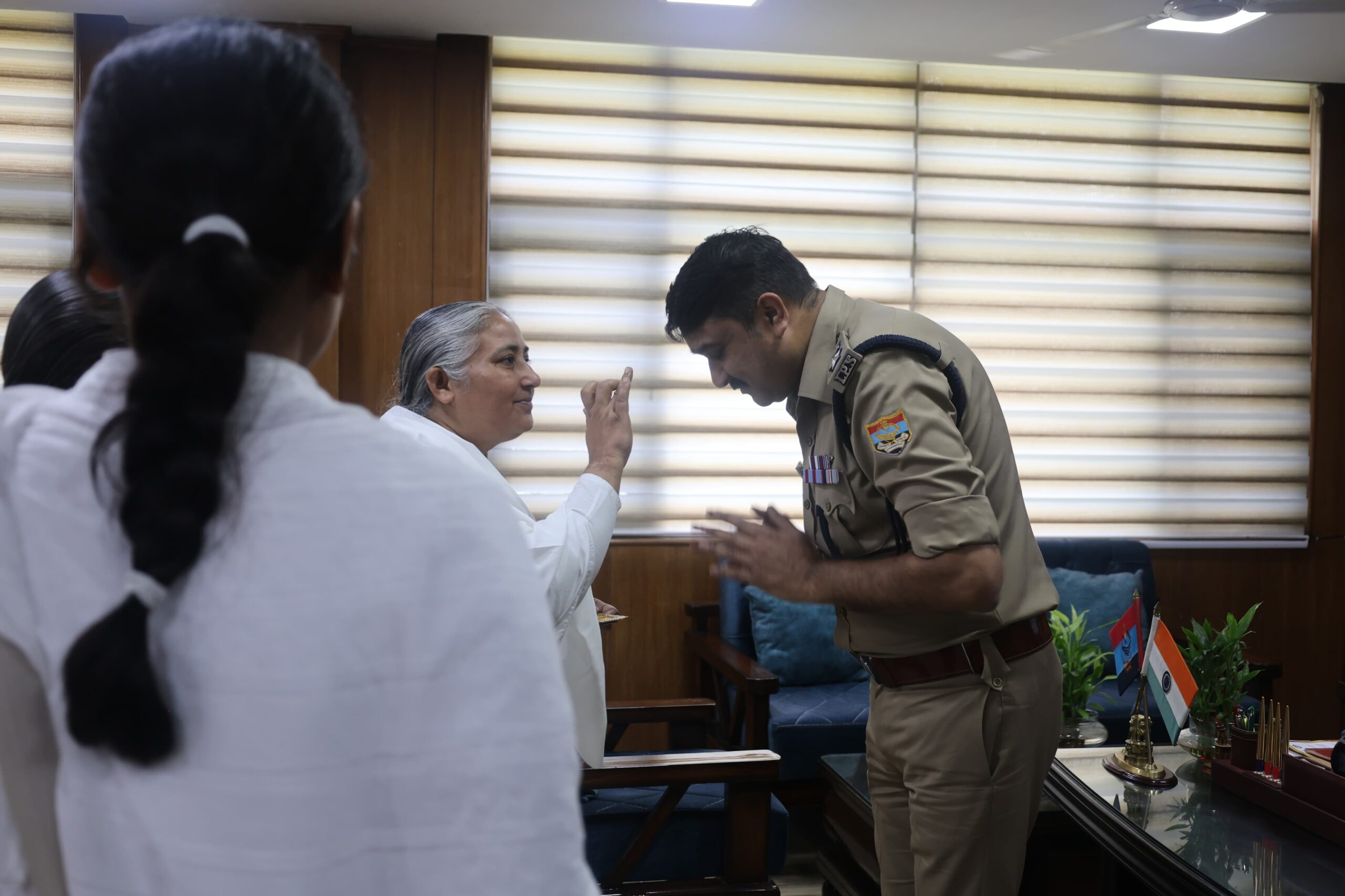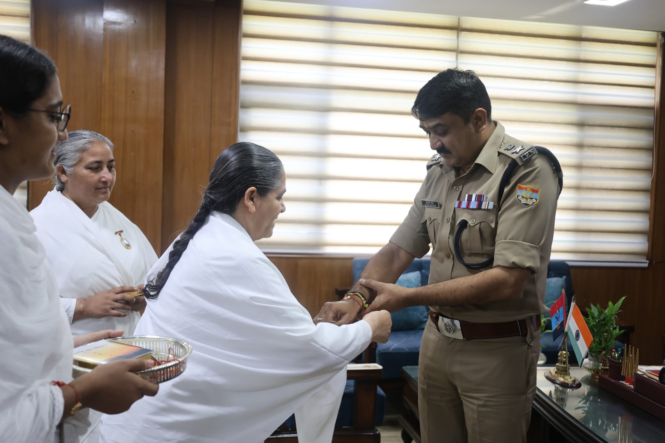 आज दिनांक – 02/08/2024 को ब्रह्मकुमारी संस्था, देहरादून से आयी बहनों द्वारा वरिष्ठ पुलिस अधीक्षक देहरादून से शिष्टाचार भेंट की गयी, भेंट के दौरान ब्रह्मकुमारी संस्था, की बहनों द्वारा वरिष्ठ पुलिस अधीक्षक को देहरादून की कलाई पर राखी बांधते हुए उनकी दीर्द्यायु की कामना की गयी। इस दौरान उपस्थित बहनों द्वारा महिला सुरक्षा के प्रति एसएसपी देहरादून द्वारा किये जा रहे प्रयासों की सराहना करते उन्हें धन्यवाद ज्ञापित किया गया।