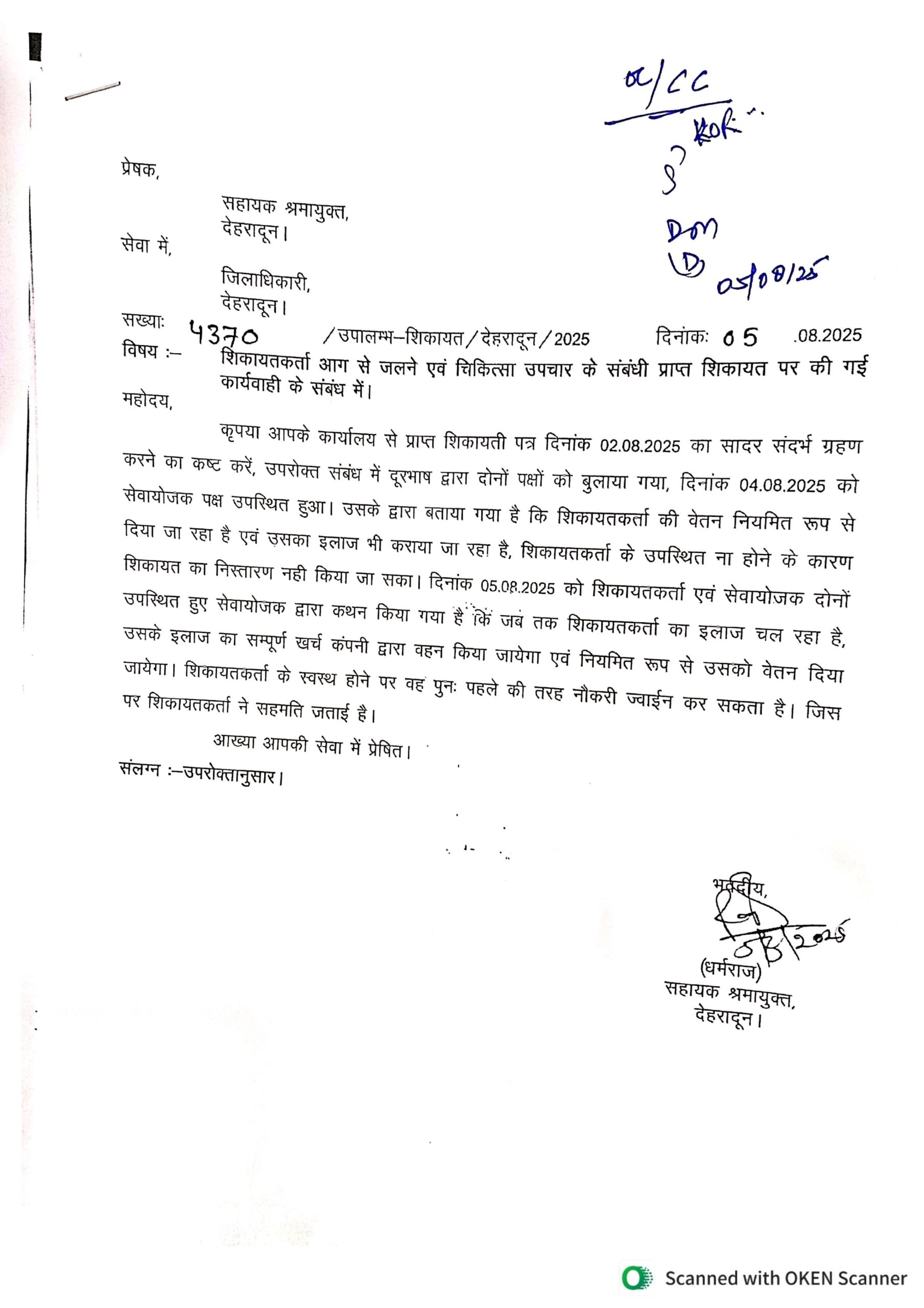 देहरादून दिनांक 08 अगस्त 2025, , बिरलती मुजफ्फरनगर उत्तर प्रदेश निवासी राहुल कुमार ने जिलाधिकारी कार्यालय कक्ष में 2 अगस्त को कलेक्टेªट पंहुचकर जिलाधिकारी सविन बसंल को फरियाद सुनाते हुए बताया कि वह हब फारमेस्यूटिकल्स एण्ड रिसर्च कम्पनी सेलाकुई में मैंटेनेंस आफिसर के पद कार्यरत है नवम्बर 2024 में कम्पनी में आग लग गई तथा आग की पेट में आने से वह बुरी तहर झुलस गए थे। अभी पूर्ण रूप से ठीक नही हो पाए है। कम्पनी ने वेतन देने तथा उपचार कराने से मना कर रही है। जनमन के अधिकारों के हनन पर प्रशासन सख्त रूप अपनाया, जिस पर कम्पनी ने सुनील कुमार के सम्पूर्ण उपचार, वेतन तथा ठीक होने के बाद रि-ज्वाईनिंग की लिखित अन्डरटेकिंग दे दी है।