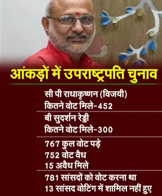 राष्ट्रीय जनतांत्रिक गठबंधन (NDA) उम्मीदवार सी. पी. राधाकृष्णन उपराष्ट्रपति पद का चुनाव जीत गए हैं। राधाकृष्णन को 452 वोट मिले, जबकि विपक्ष के उम्मीदवार बी सुदर्शन रेड्डी को 300 मत हासिल हुए। उपराष्ट्रपति चुनाव में कुल 767 वोट डाले गए, 752 वैध और 15 अवैध थे। उपराष्ट्रपति चुनाव के लिए मंगलवार को संसद भवन में सुबह 10 बजे से शाम पांच बजे तक वोटिंग हुई। कुल 768 सांसदों ने वोट डाले। लोकसभा और राज्यसभा मिलाकर भारत की संसद में कुल 788 सांसद होते हैं। वर्तमान में दोनों सदनों को मिलाकर 7 सीटें रिक्त हैं। इस तरह कुल 781 सांसदों को वोट करना था, जिसमें से 13 वोटिंग में शामिल नहीं हुए। इनमें बीआरएस के 4, बीजेडी के 7, अकाली दल के 1 और 1 निर्दलीय सांसद ने वोट नहीं डाला। एनडीए 427 सांसदों ने वोट किया।