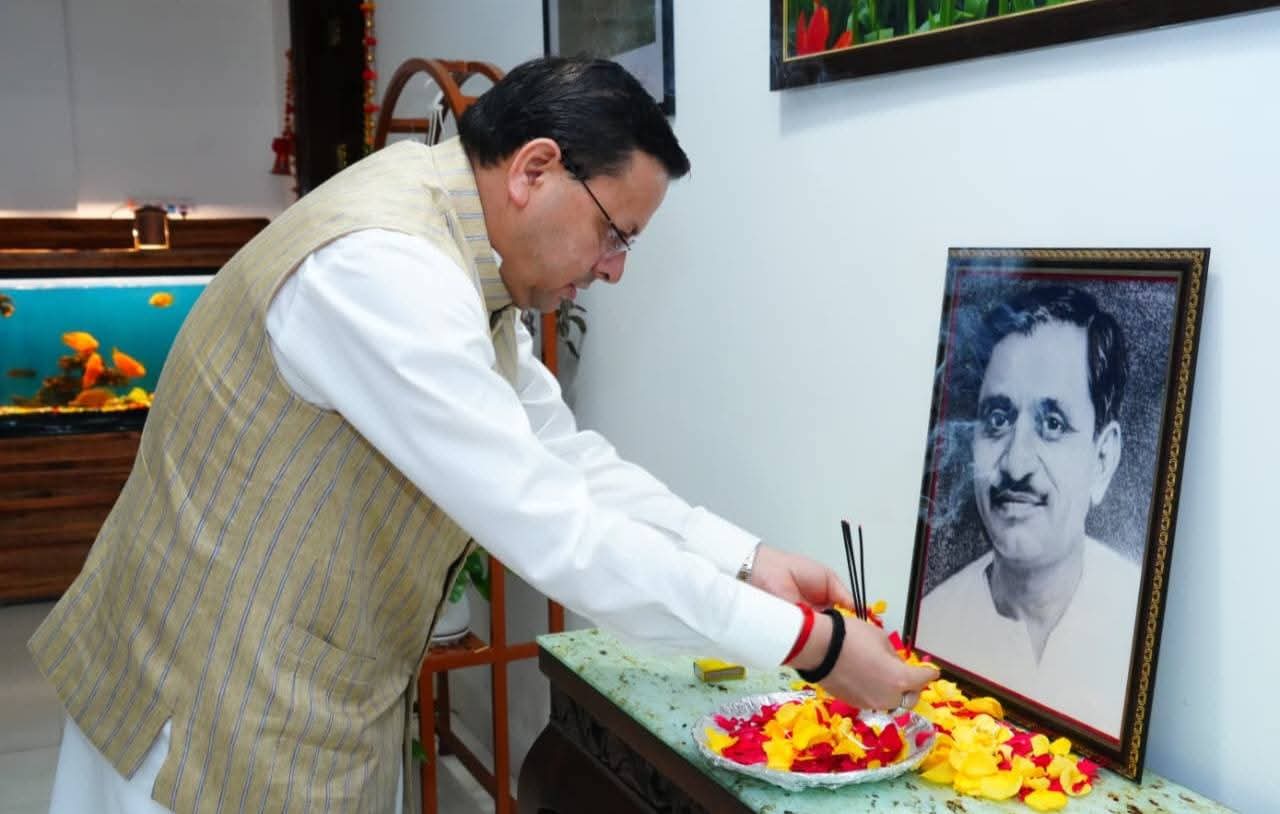 मुख्यमंत्री पुष्कर सिंह धामी ने आज उधमसिंह नगर के खटीमा के नगला तराई में अपने निजी आवास पर पंडित दीन दयाल उपाध्याय के जन्म दिवस (Pandit Deendayal Upadhyay birth anniversary) पर उनके चित्र पर माल्यार्पण कर श्रद्धांजलि दी. इस मौके पर मुख्यमंत्री धामी ने कहा कि एकात्म मानववाद के प्रणेता पंडित दीनदयाल उपाध्याय के विचार, आदर्श समाज की संकल्पना को साकार करते हैं. उनकी अंत्योदय की विचारधारा के माध्यम से ही समग्र राष्ट्र ही नहीं, समग्र विश्व का विकास हो सकता है.