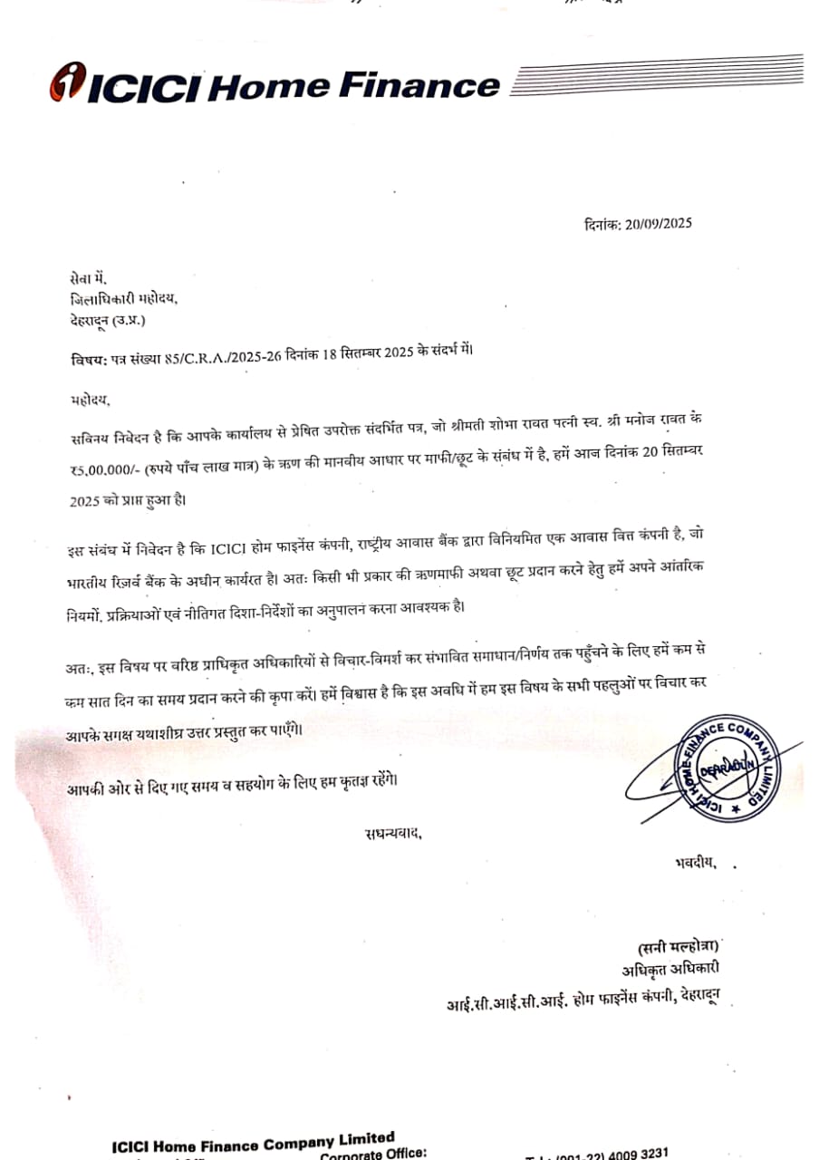 देहरादून दिनांक 30 सितम्बर 2025,(सूवि), जिला प्रशासन देहरादून अपने त्वरित एक्शन से जहां जनमानस में सरकार, शासन-प्रशासन के प्रति विश्वास बढा है वहीं असहाय व्यथितों को न्याय मिल रहा है। जिलाधिकारी सविन बंसल के समक्ष आने वाले फरियादियों को शिक्षा, रोजगार, ऋणमाफी, सम्पति वापसी के साथ ही न्याय मिल रहा है, जिससे जनमानस में सरकार, प्रशासन, शासन की न्यायप्रिय छवि बढी है तथा न्याय पर विश्वास जगा है। इसी का ताजा उदाहरण विधवा शोभा जिसके 02 बच्चें है तथा बालक शत् प्रतिशत् दिव्यांग है का जिला प्रशासन ने आईसीआईसीआई बैंक से ऋण माफ कराकर एनओसी जारी करवा दी है। जिससे विधवा के कर्ज तले दबे अंधेरे जीवन में रोशनी भर दी है। जिसे घर का खर्चा, बेटी की पढाई बच्चों की परवरिश और बैंक ऋण जमा करने का डर सता रहा था, जिसे जिला प्रशासन के प्रयासों से राहत मिल गई है।