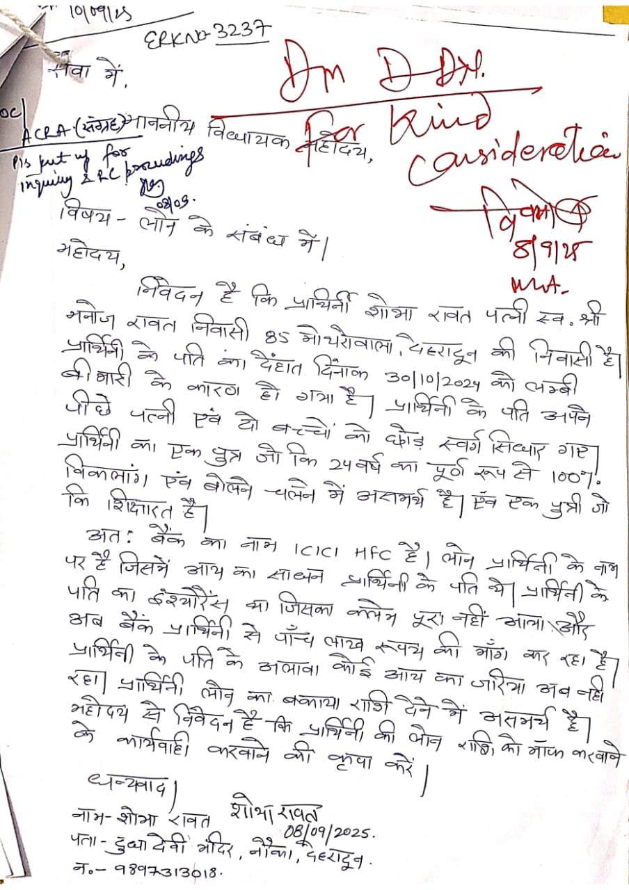 जिलाधिकारी कार्यालय कक्ष क्लेक्टेªट में विधवा शोभा ने जिलाधिकारी से मिलकर गुहार लगाई कि उसके पति की मृत्यु वर्ष 2024 में हो गई थी। शोभा रावत पत्नी स्व० मनोज रावत ने जिलाधिकारी के समक्ष प्रस्तुत होकर गुहार लगाई कि उन्होंने आईसीआईसीआई बैंक शाखा से 10,00,000/- तथा 7,00,000/- कुल 17,00,000/- का लोन लिया था। शोभा केे पति मनोज रावत की मृत्यु 30.10.2024 को हो गयी थी। दो बच्चे जिनमें एक बिटिया पढाई करती है तथा बेटा 100 प्रतिशत् दिव्यांग है। बैंक द्वारा पति की मृत्यु के उपरांत इंश्योरेंस की क्लेम कुल रू० 13,20,662/- की धनराशि को लोन की धनराशि में समायोजित किया गया तथा लगभग रू0 5,00,000/- की धनराशि जमा की जानी अवशेष है।
