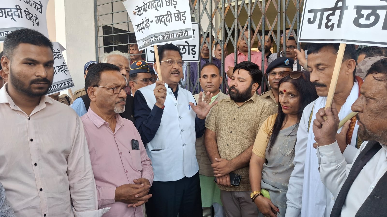 देहरादून: देश व्यापी वोट चोर गद्दी छोड़ अभियान के तहत आज उत्तराखंड प्रदेश कांग्रेस कमेटी के वरिष्ठ उपाध्यक्ष संगठन सूर्यकांत धस्माना के नेतृत्व में पार्टी के कार्यकर्ताओं ने रिंग रोड स्थित राज्य निर्वाचन आयोग कार्यालय का घिराव कर वहां जबरदस्त प्रदर्शन किया व प्रदेश के राज्यपाल लेफ्टीनेंट जनरल गुरमीत सिंह से तत्काल राज्य के राज्य निर्वाचन आयुक्त सुशील कुमार को बर्खास्त करने की मांग की। अपने पूर्व घोषित कार्यक्रम के अनुसार काफी संख्या में कांग्रेस कार्यकर्ता प्रदेश उपाध्यक्ष संगठन सूर्यकांत धस्माना के नेतृत्व में साढ़े बारह बजे राज्य निर्वाचन आयोग कार्यालय पहुंचे जहां कार्यक्रम की सूचना पा कर पहले ही बड़ी संख्या में सीओ रायपुर के नेतृत्व में भरी पुलिस बल तैनात था। आयोग के कार्यालय के मुख्य द्वार से श्री धस्माना के नेतृत्व में कार्यकर्ता हाथों में तख्तियां लिए राज्य निर्वाचन आयुक्त के कार्यालय की ओर बड़े जहां सीओ रायपुर ने श्री धस्माना को बताया कि राज्य निर्वाचन आयुक्त कार्यालय में उपस्थित नहीं है जिस पर श्री धस्माना व अन्य कार्यकर्ताओं ने प्रदर्शन शुरू कर दिया और पूरा आयोग परिसर वोट चोर गद्दी छोड़ के नारों से गूंज उठा।