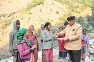 बदरीनाथ राष्ट्रीय राजमार्ग पर कार्य कर रहे श्रमिकों को मिठाई खिलाकर उनका उत्साहवर्धन करते मंत्री गणेश जोशी