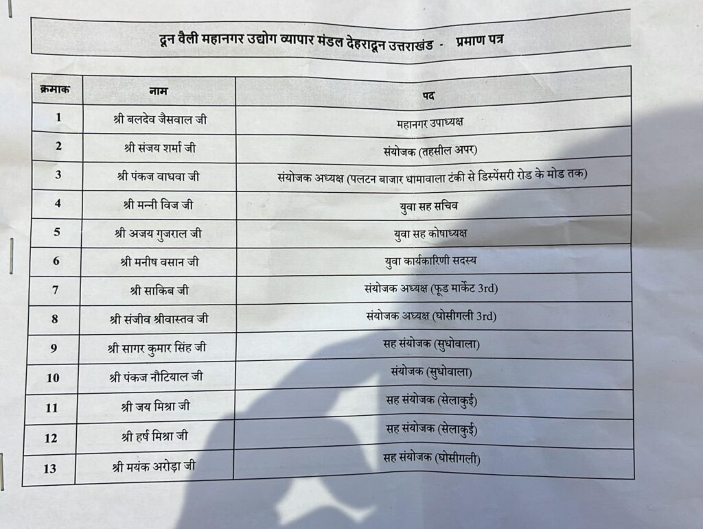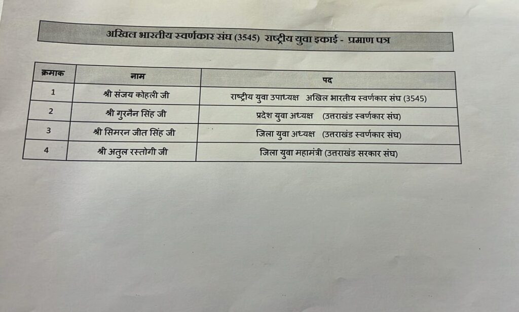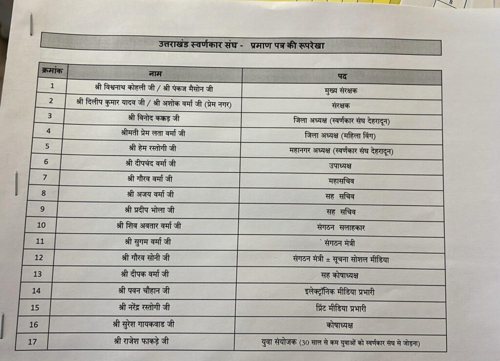 उत्तराखंड स्वर्णकार संघ (प्रदेश एवं जिला इकाई) तथा दून वैली महानगर उद्योग व्यापार मंडल (रजि.) देहरादून के संयुक्त तत्वावधान में सोमवार को होटल एस.जे. पैराडाइज, निरंजनपुर में भारत सरकार की एमएसएमई योजना के अंतर्गत प्रमाण पत्र वितरण एवं सम्मान समारोह का भव्य आयोजन किया गया। कार्यक्रम में जिला स्वर्णकार संघ की नवनियुक्त जिला कार्यकारिणी की घोषणा भी की गई।