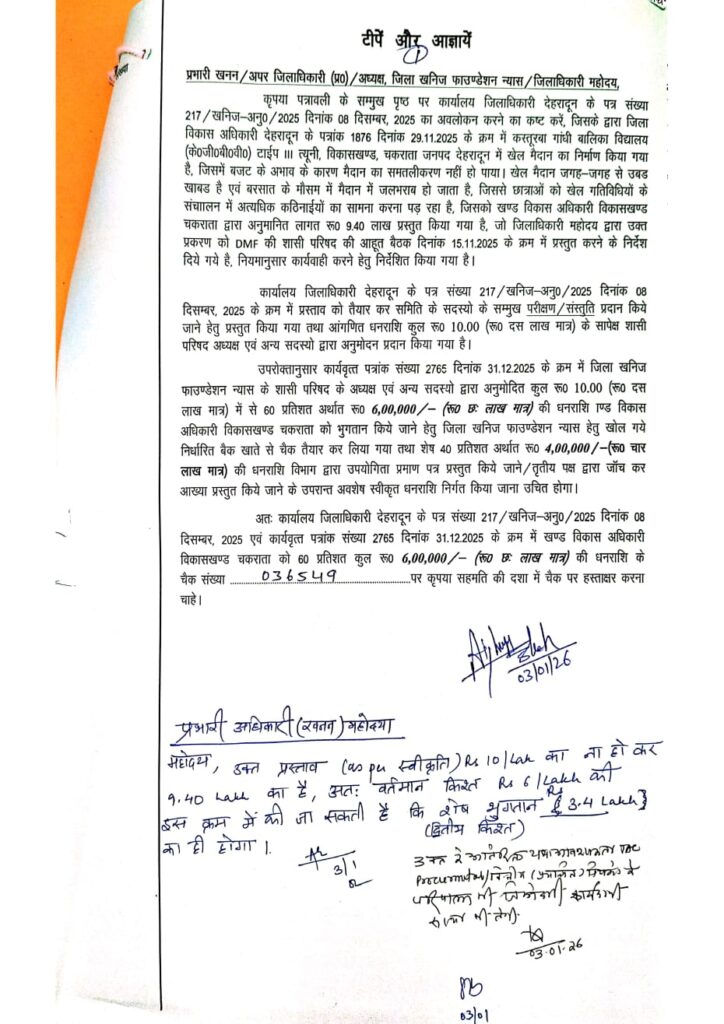 माननीय मुख्यमंत्री के मार्गदर्शन एवं जिला प्रशासन के सतत प्रयासों से जनपद देहरादून की शिक्षा व्यवस्था आधुनिकता की ओर अग्रसर है। इसी क्रम में जिलाधिकारी सविन बंसल द्वारा कस्तूरबा गांधी बालिका विद्यालय (केजीबीवी) टाइप-I, त्यूनी, विकासखण्ड चकराता में खेल मैदान के समतलीकरण हेतु जिला खनिज फाउंडेशन न्यास (DMF) से कुल ₹10.00 लाख की धनराशि स्वीकृत की गई है। इसमें से ₹6.00 लाख की प्रथम किस्त जारी कर दी गई है।
