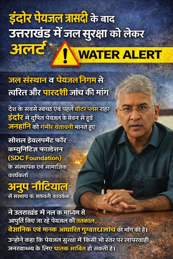 देश के सबसे स्वच्छ एवं पहले वॉटर प्लस शहर इंदौर में दूषित पेयजल के सेवन से हुई व्यापक जनहानि को गंभीर चेतावनी मानते हुए सोशल डेवलपमेंट फॉर कम्युनिटीज़ फाउंडेशन (SDC Foundation) के संस्थापक एवं सामाजिक कार्यकर्ता अनूप नौटियाल ने उत्तराखंड जल संस्थान और पेयजल निगम के मुख्य महाप्रबंधक व निदेशक को एक विस्तृत पत्र भेजकर राज्य में पेयजल सुरक्षा को लेकर तत्काल कदम उठाने की मांग की है।