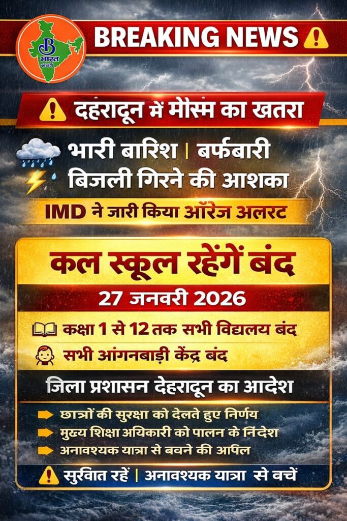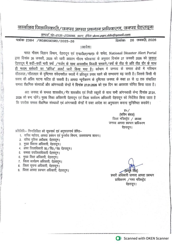 मौसम की गंभीर स्थिति को देखते हुए जिला मजिस्ट्रेट एवं अध्यक्ष, जनपद आपदा प्रबंधन प्राधिकरण देहरादून द्वारा आदेश जारी कर जनपद के कक्षा 1 से 12 तक संचालित सभी शासकीय, अशासकीय एवं निजी विद्यालयों में 27 जनवरी 2026 को एक दिन का अवकाश घोषित किया गया है।